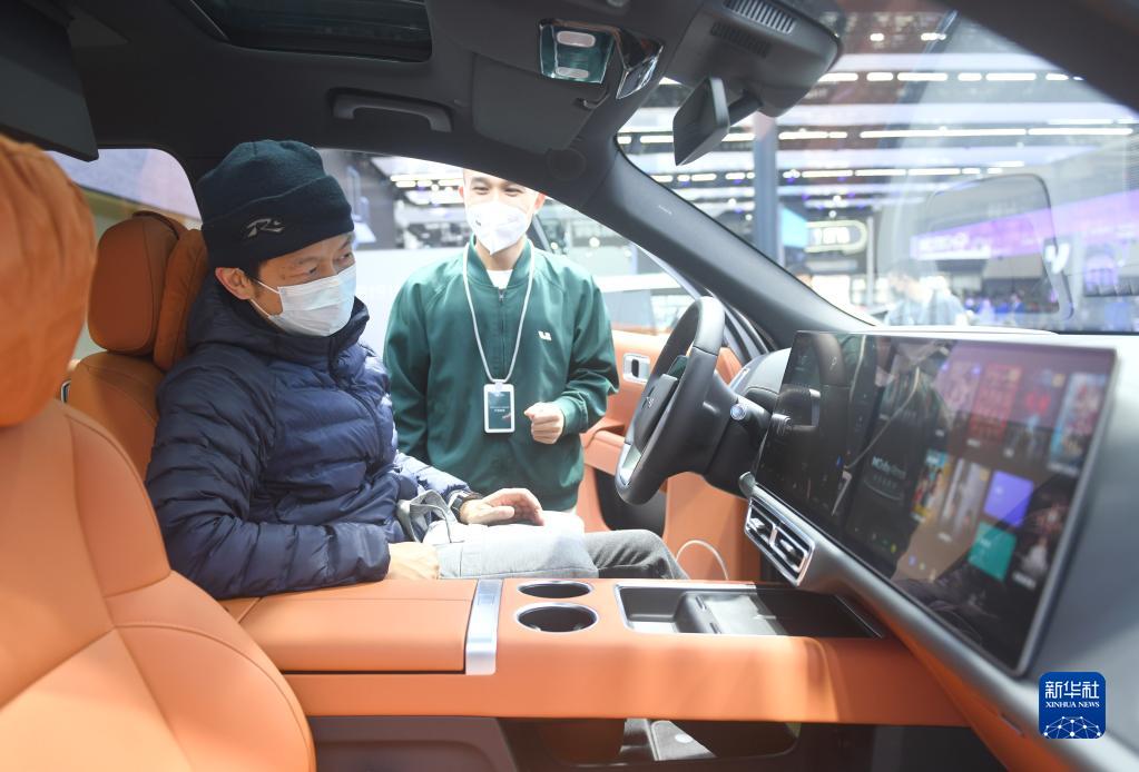 12月30日,觀(guān)眾在車(chē)展上體驗一款汽車(chē)。