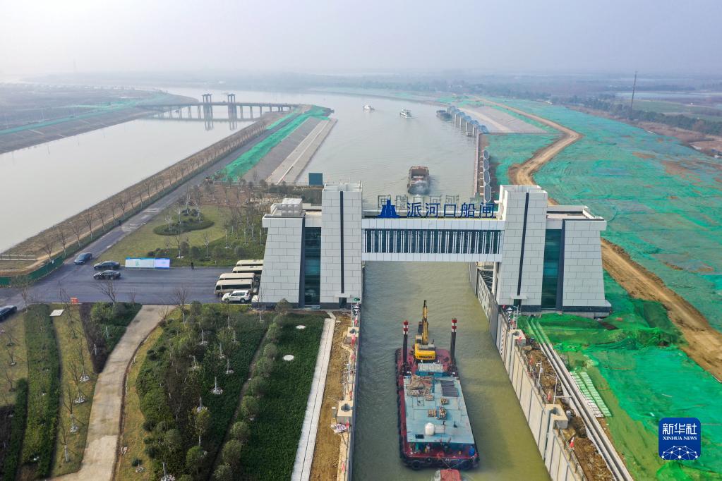 12月30日,船只通過(guò)引江濟淮派河口船閘(無(wú)人機照片)。