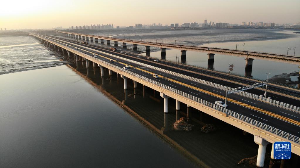這是12月30日拍攝的建成通車(chē)的青蘭高速公路改擴建工程女姑口跨海特大橋(無(wú)人機照片)。新華社記者 李紫恒 攝
