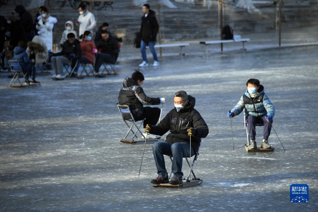 12月31日,人們在北京大學(xué)未名湖冰場(chǎng)上玩冰車(chē)。