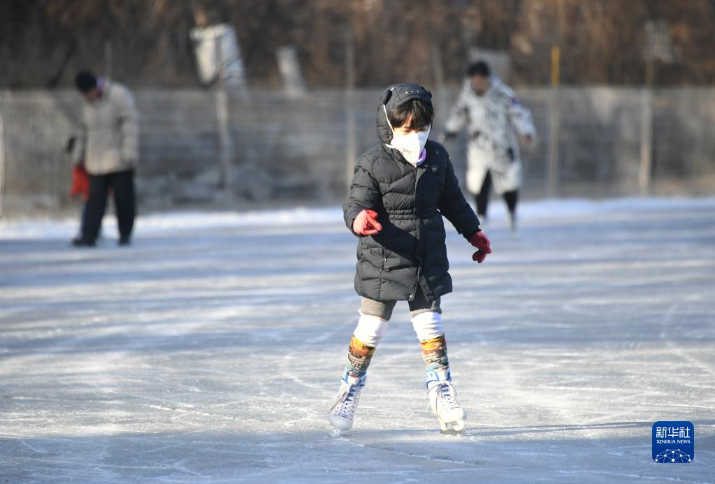 12月31日,小朋友在北京大學(xué)未名湖冰場(chǎng)上滑冰。