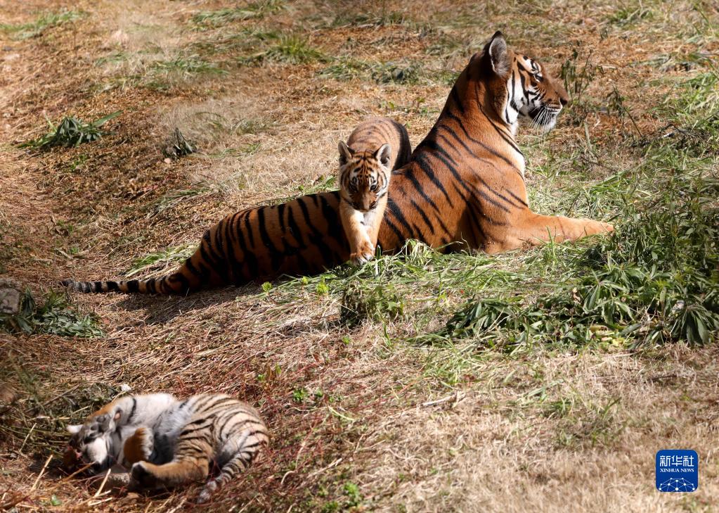 12月31日,在中國華南虎蘇州培育基地,雙胞胎小華南虎與虎媽媽在一起。