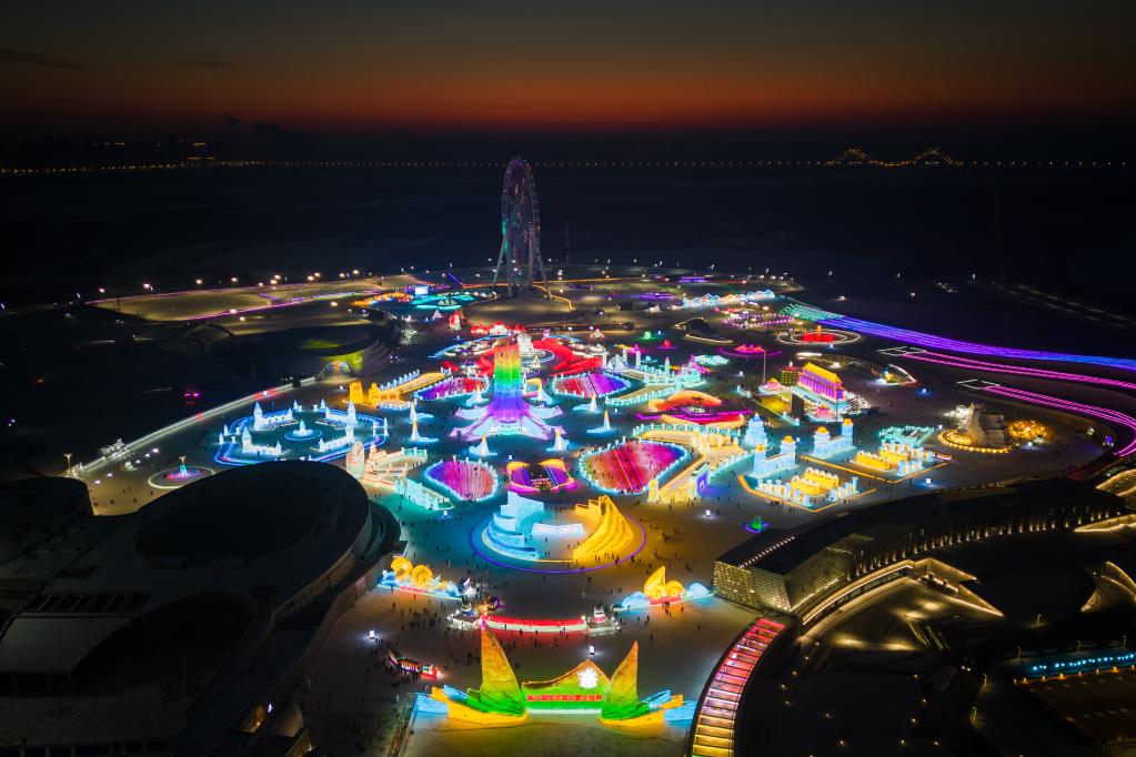 12月31日,游客在哈爾濱冰雪大世界園區游覽(無(wú)人機照片)。