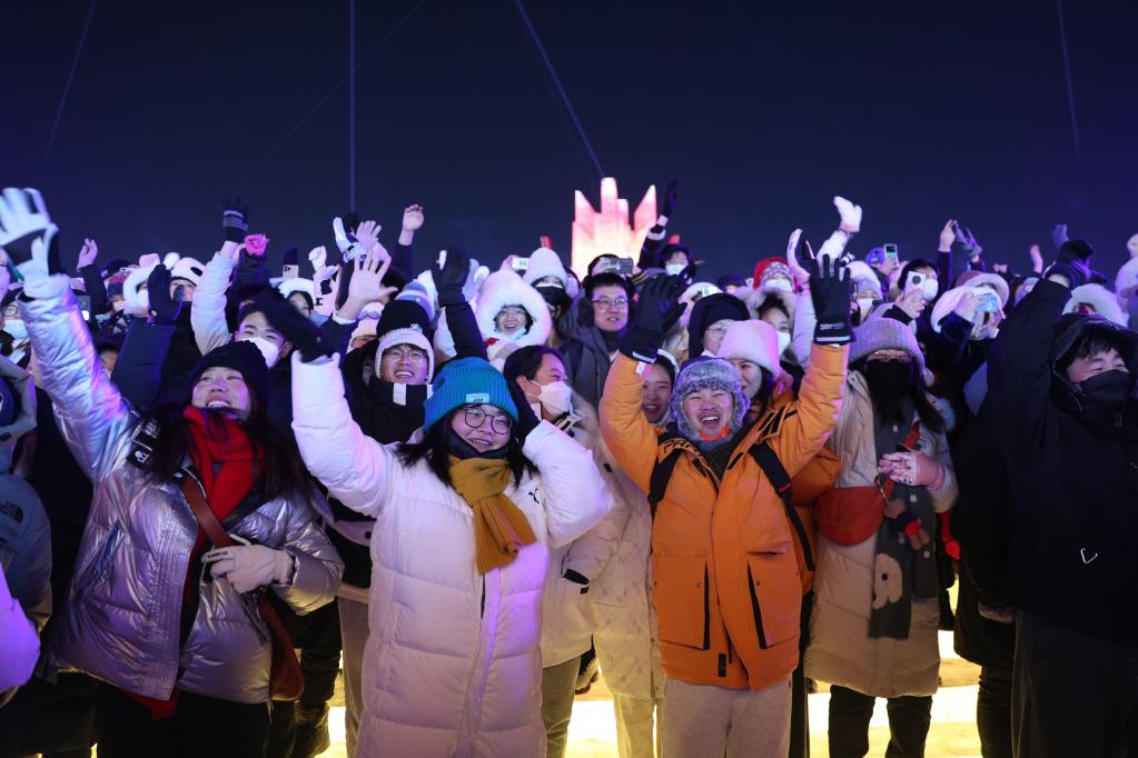 當日,許多市民和游客來(lái)到哈爾濱冰雪大世界園區游玩,迎接新年到來(lái)。