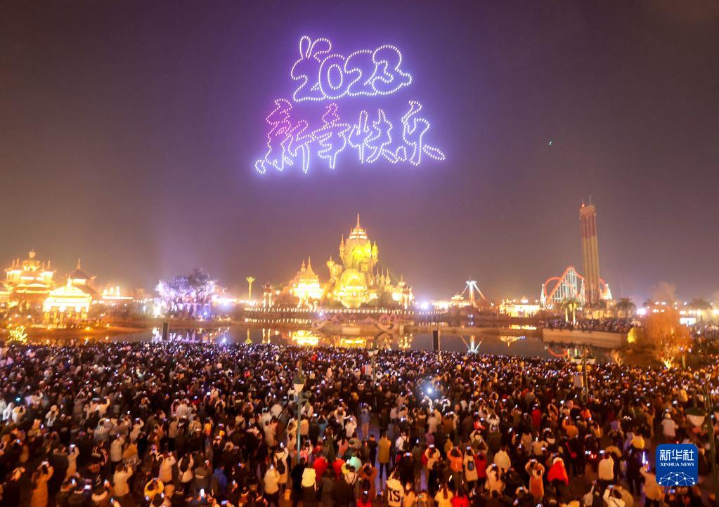 2022年12月31日,在江蘇省淮安市西游樂(lè )園,游客在觀(guān)看無(wú)人機編隊在夜空中組成的造型。