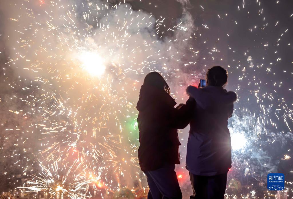 1月1日,群眾在貴州省黔西市水西公園燃放煙花慶祝新年的到來(lái)。