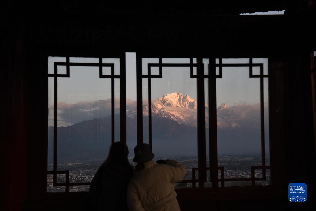 1月1日,游客在云南省麗江古城萬(wàn)古樓觀(guān)看玉龍雪山的晨景。
