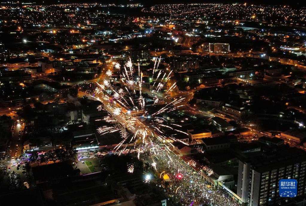 這是2023年1月1日在納米比亞首都溫得和克拍攝的新年煙花。
