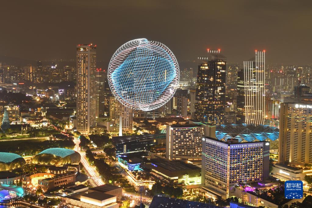 這是2022年12月31日在新加坡濱海灣拍攝的無(wú)人機燈光秀。