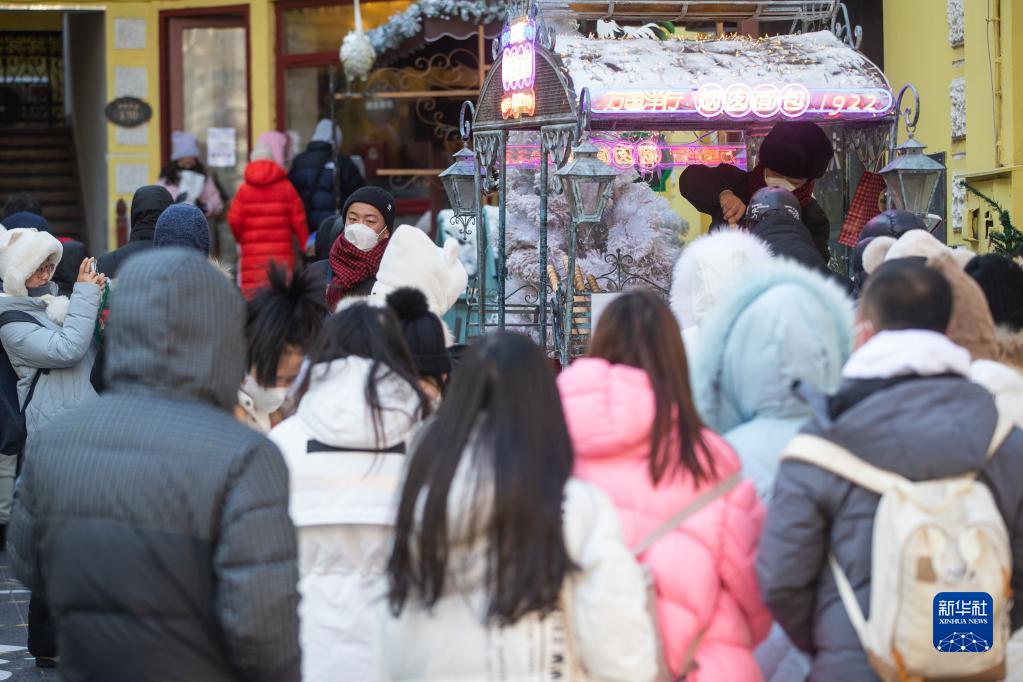 1月1日,游客在哈爾濱道里區中央大街排隊購買(mǎi)食品。