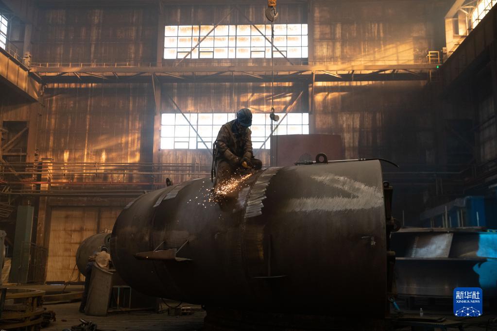 1月1日,在哈電集團哈爾濱電機廠(chǎng)有限責任公司生產(chǎn)車(chē)間,工人在生產(chǎn)作業(yè)。