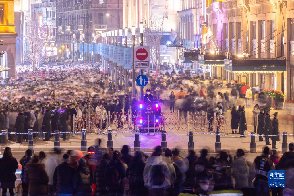 1月1日凌晨,武警上??傟牂C動(dòng)第一支隊官兵在南京東路路口以“環(huán)島”形式疏導人流。