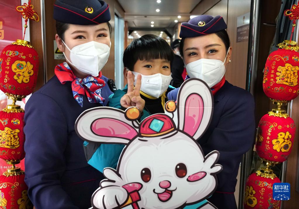 在2023年元旦到來(lái)之際,列車(chē)工作人員將車(chē)廂布置一新,舉行了“你好2023,相約2023”賀新年活動(dòng),為旅客獻上歡快的演出,送上新年的祝福。