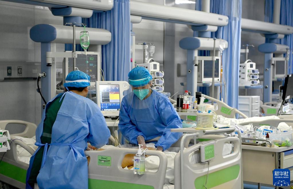 2022年12月31日,西安交通大學(xué)第一附屬醫院急診科EICU的醫務(wù)人員在護理重癥患者。