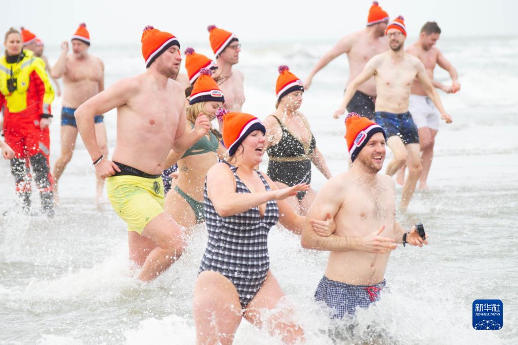 1月1日,人們在荷蘭布盧門(mén)達爾參加冬泳活動(dòng),慶祝新年到來(lái)。