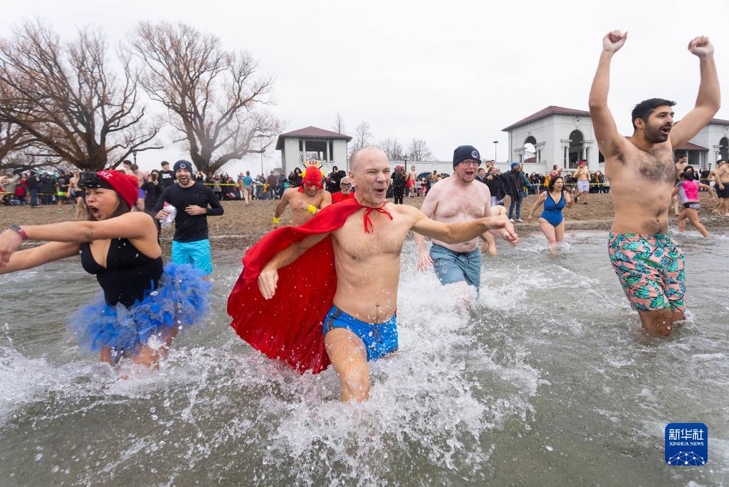 1月1日,在加拿大多倫多,冬泳活動(dòng)參與者沖入安大略湖中。