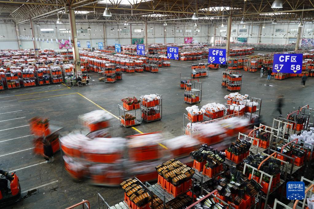 1月2日拍攝的昆明國際花卉拍賣(mài)交易中心忙碌的景象。