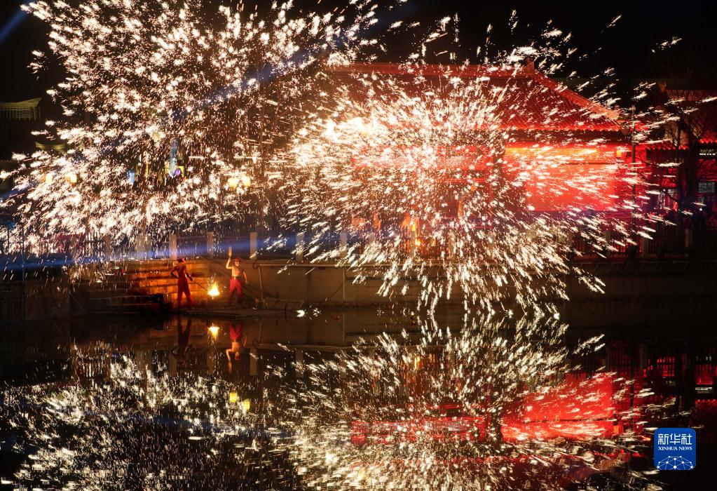 2022年12月31日,工作人員在位于鄭州市中牟縣的電影小鎮里表演打鐵花。