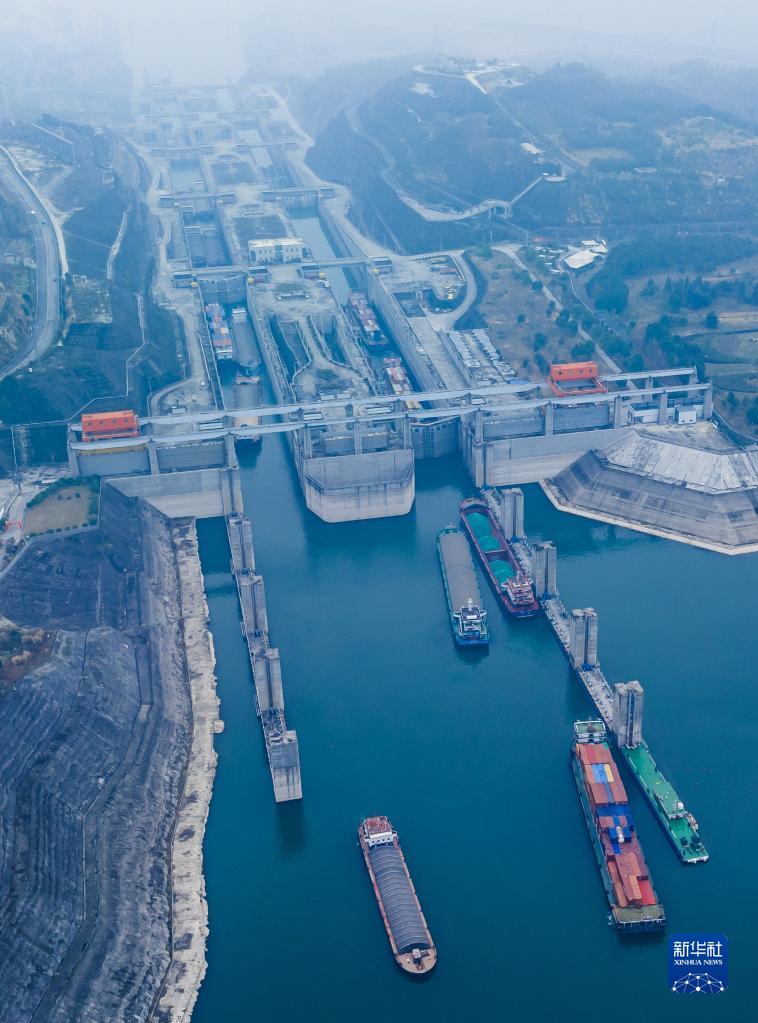 1月2日,船舶有序通過(guò)三峽雙線(xiàn)五級船閘(無(wú)人機照片)。