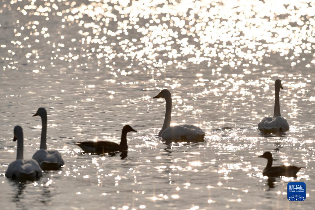 1月2日,大天鵝在三河口天鵝灘濕地的水面上游弋。
