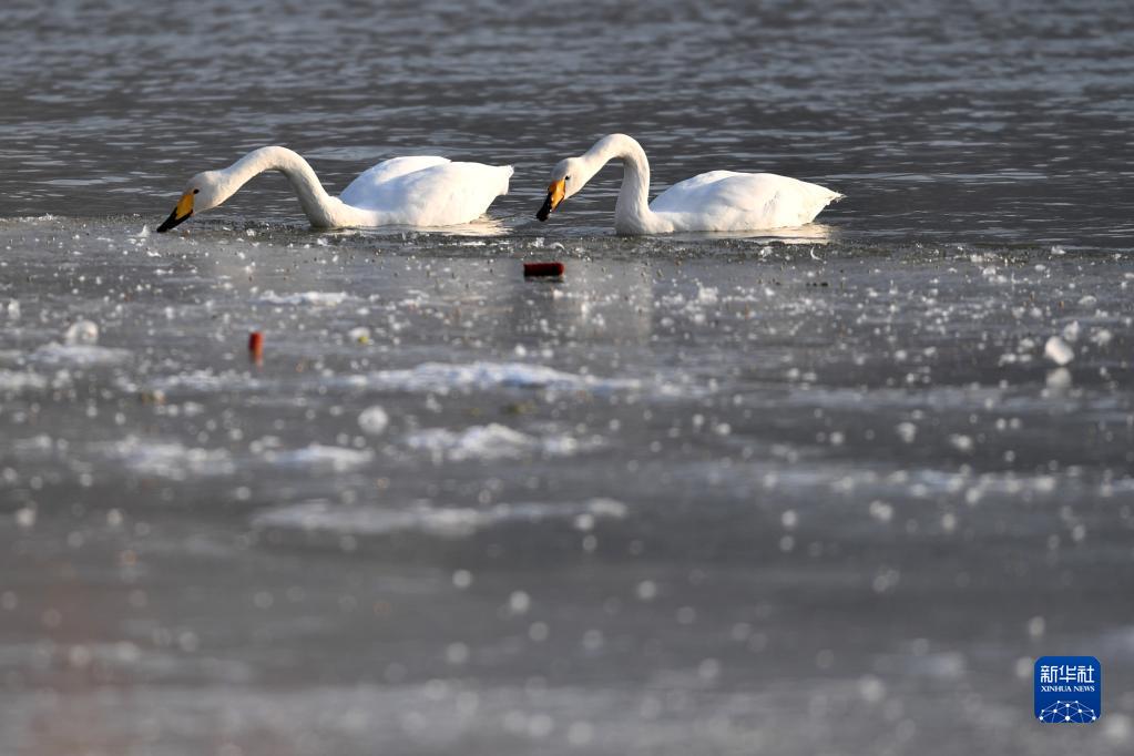 1月2日,大天鵝在三河口天鵝灘濕地覓食。