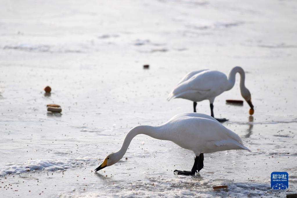 1月2日,大天鵝在三河口天鵝灘濕地覓食。