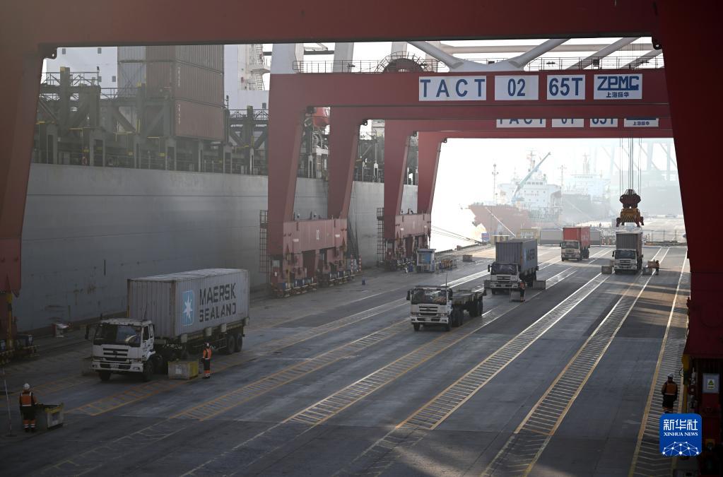 1月1日,卡車(chē)在天津港聯(lián)盟國際集裝箱碼頭運輸集裝箱。