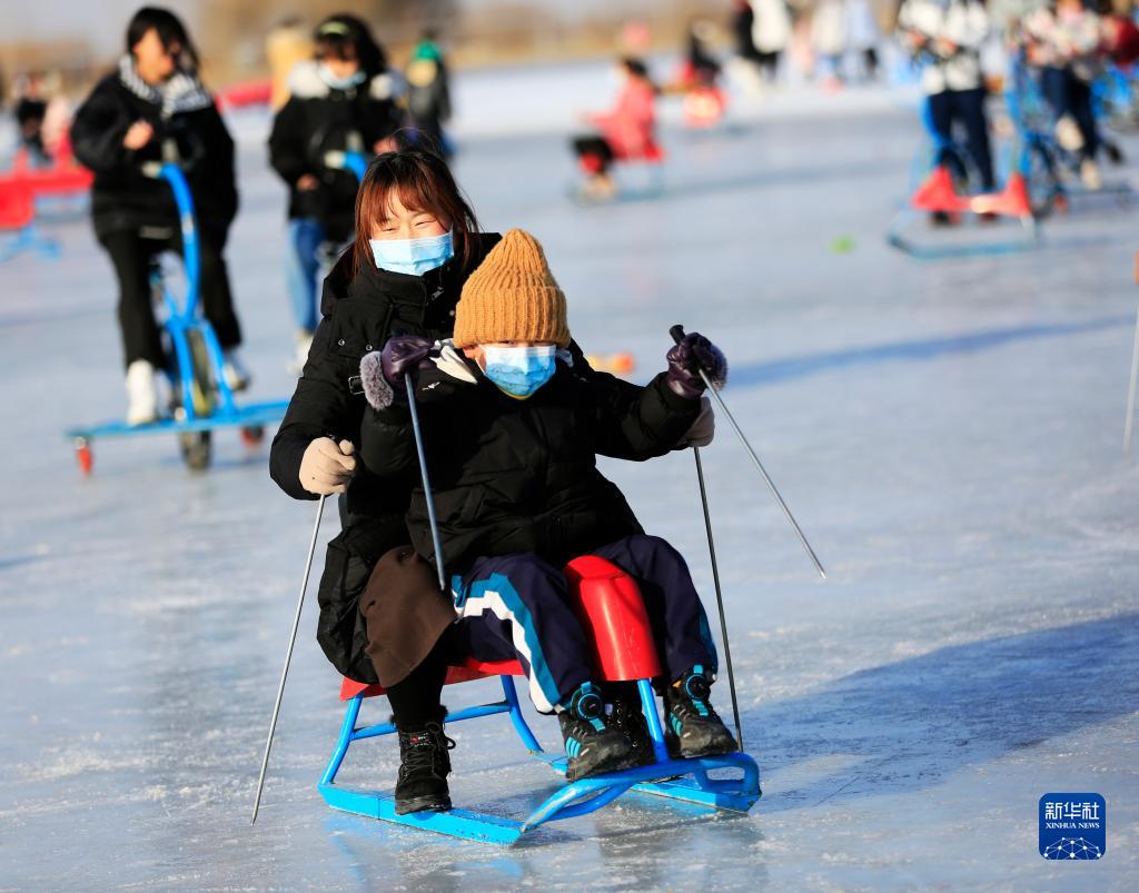1月1日,市民在甘肅張掖國家濕地公園滑冰場(chǎng)坐滑冰車(chē)。