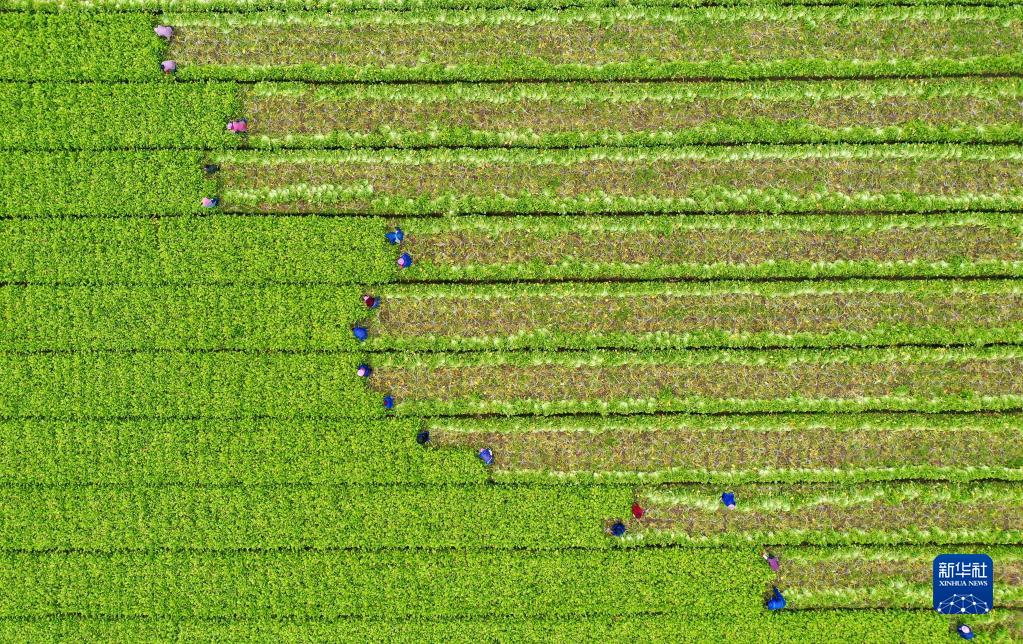 1月3日,在浙江省溫嶺市石橋頭鎮楊家浦村,種菜大戶(hù)組織農民采收葉用芥菜(無(wú)人機照片)。