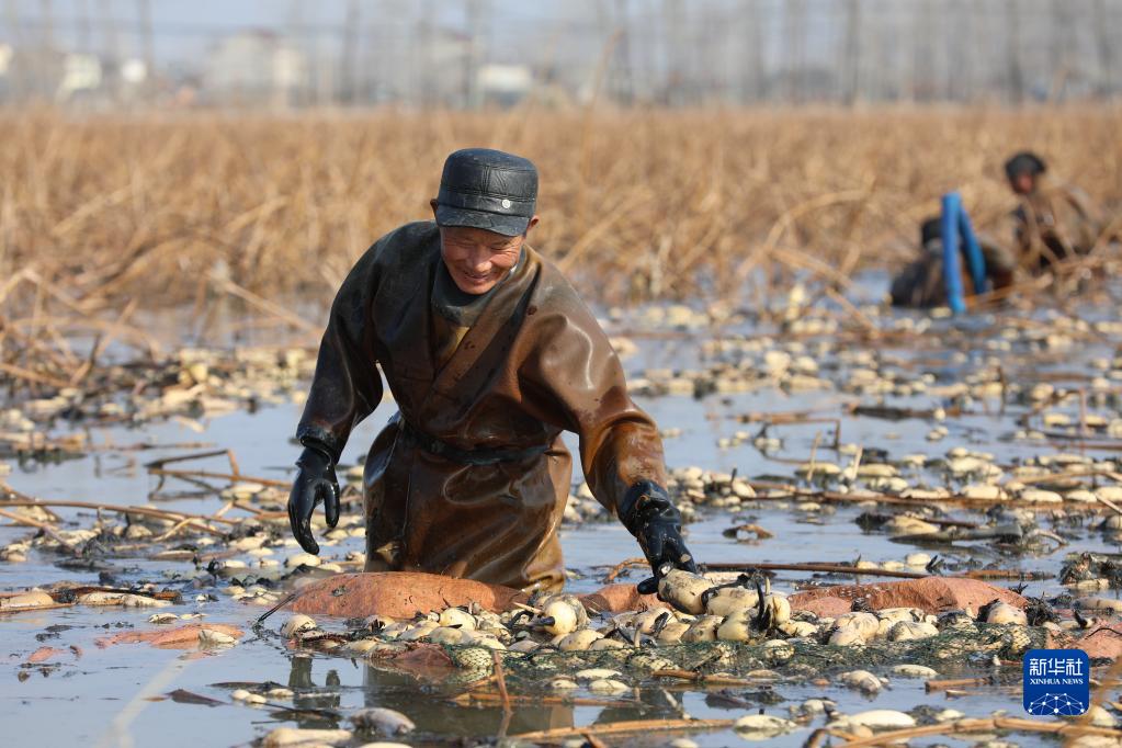 1月3日,在江蘇省淮安市洪澤區朱壩街道,農民在采挖蓮藕。