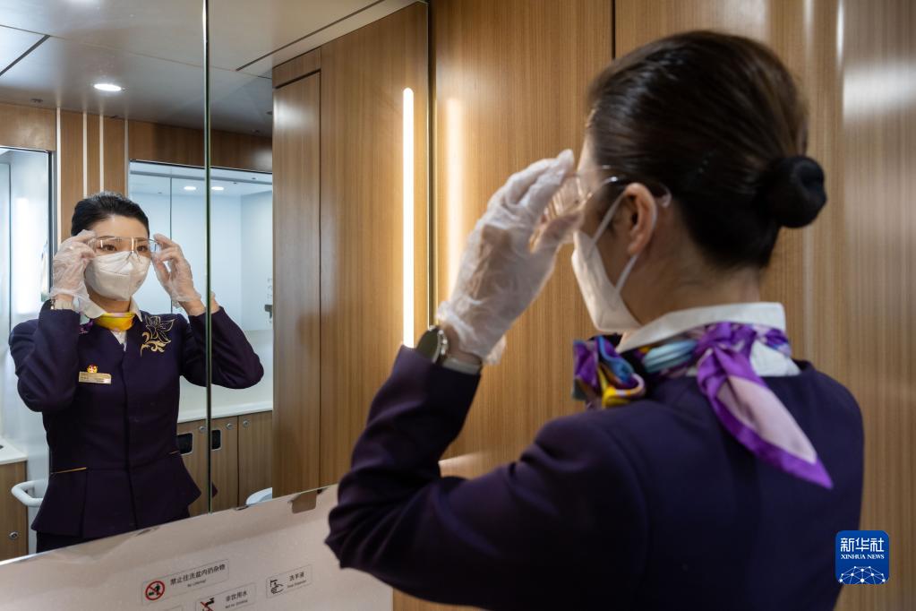 1月4日,鐵路上??瓦\段乘務(wù)員在列車(chē)上戴護目鏡。