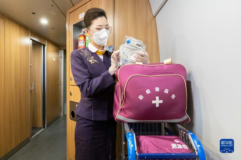 1月4日,鐵路上??瓦\段乘務(wù)員在列車(chē)上整理防疫備品包。