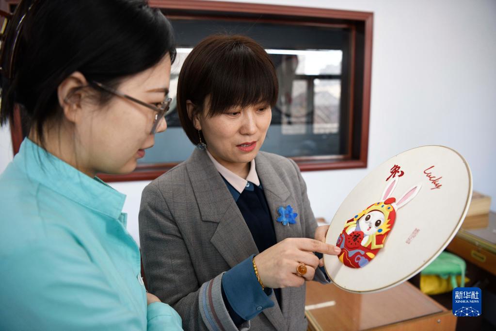 1月4日,在豐寧縣非遺布糊畫(huà)就業(yè)工坊,布糊畫(huà)傳承人郝如香(右)在介紹布糊畫(huà)制作技巧。