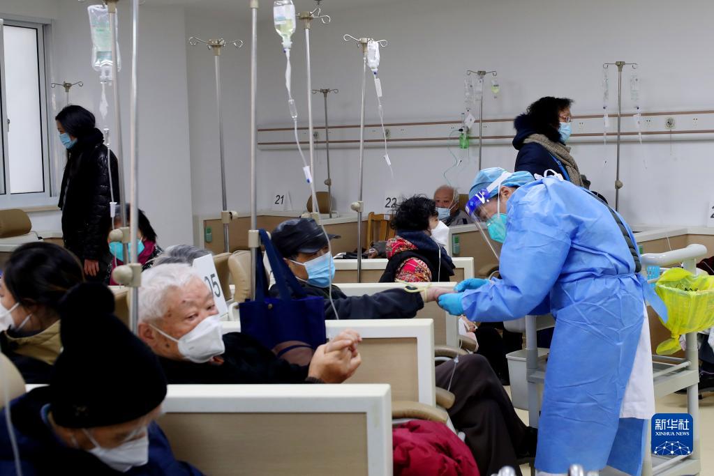 1月4日,醫務(wù)人員在上海市斜土街道社區衛生服務(wù)中心輸液室內為病人輸液。