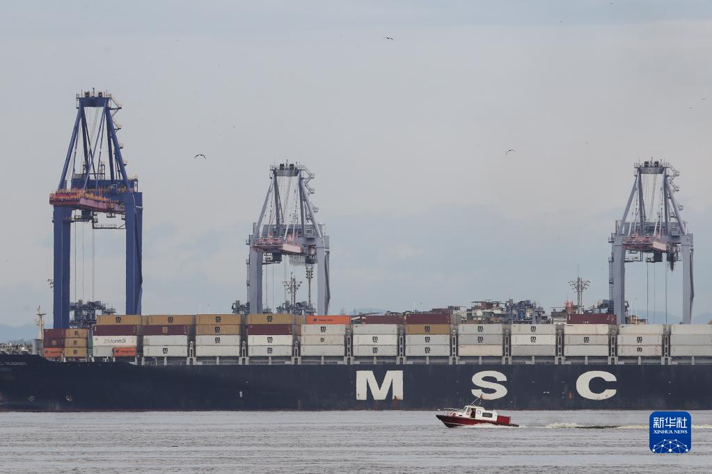 1月4日,一艘集裝箱貨輪??吭诎臀骼锛s熱內盧瓜納巴拉灣的碼頭。