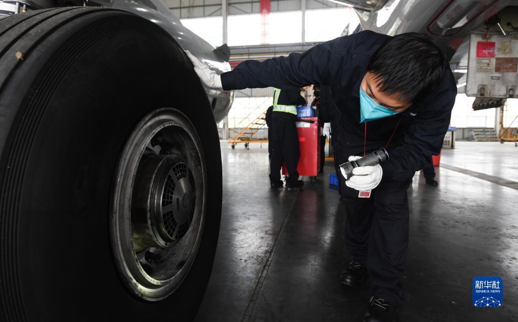春運將至,航空公司組織工程師加強飛機檢修維護工作,保障旅客出行安全。