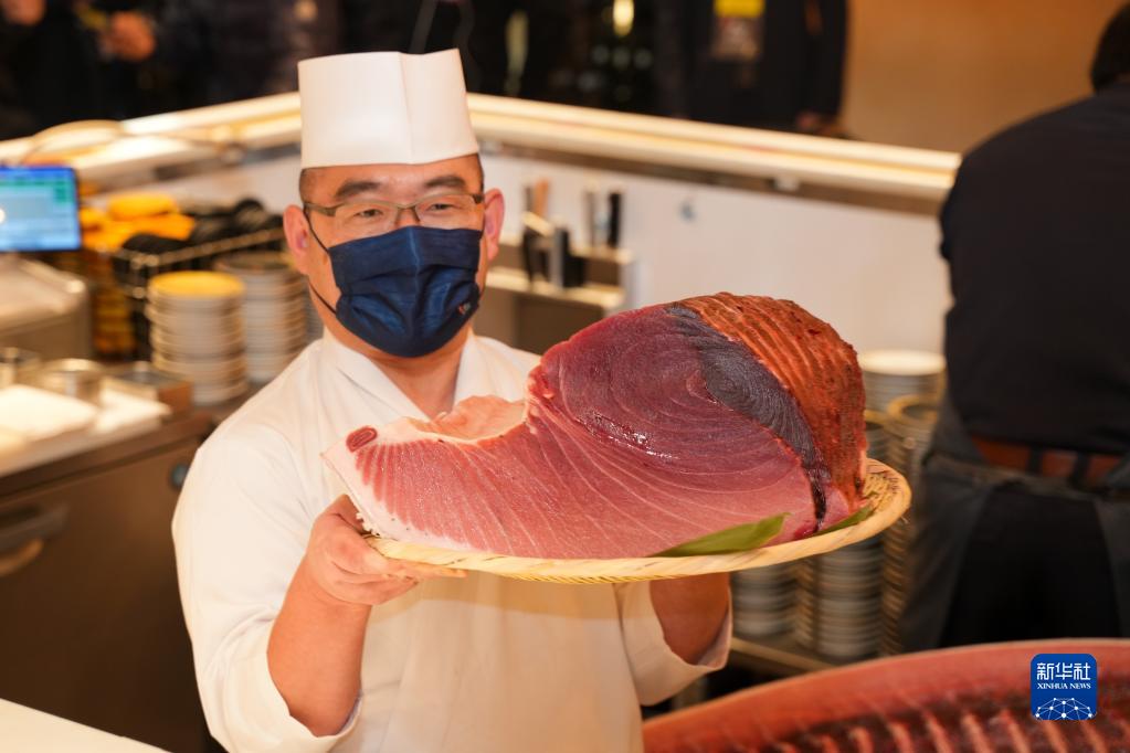 1月5日,廚師在日本東京表參道一家餐館向媒體展示最高價(jià)金槍魚(yú)的魚(yú)肉。