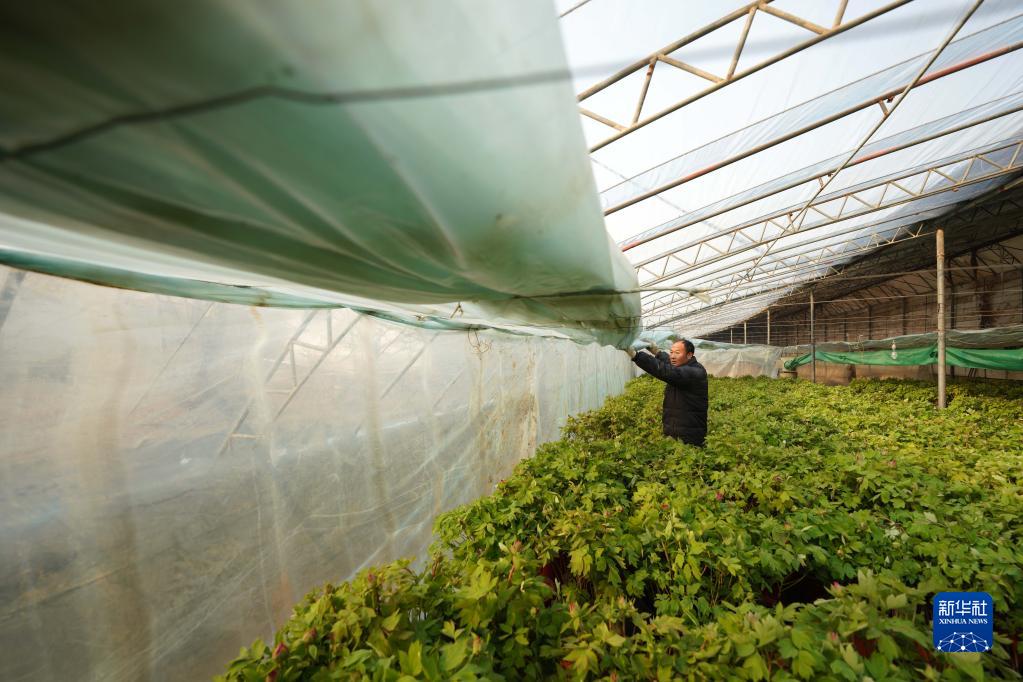 1月5日,花農在河北省柏鄉縣漢牡丹園種植大棚內通過(guò)調整遮光簾控制棚內溫度。