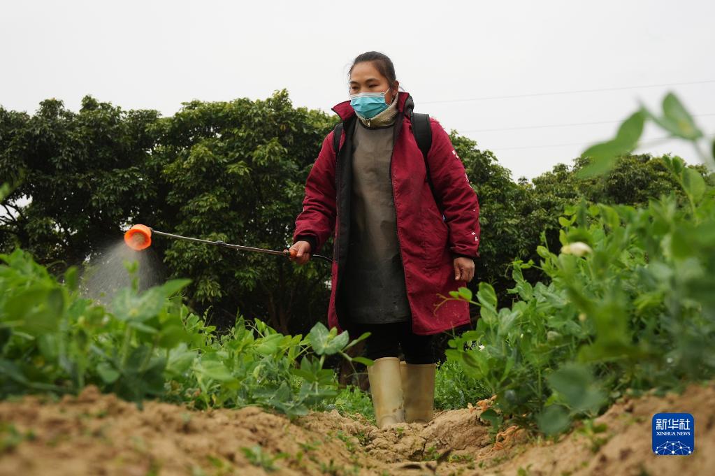 1月5日,在廣西融水苗族自治縣融水鎮水東村,一名村民在菜田噴灑肥料。