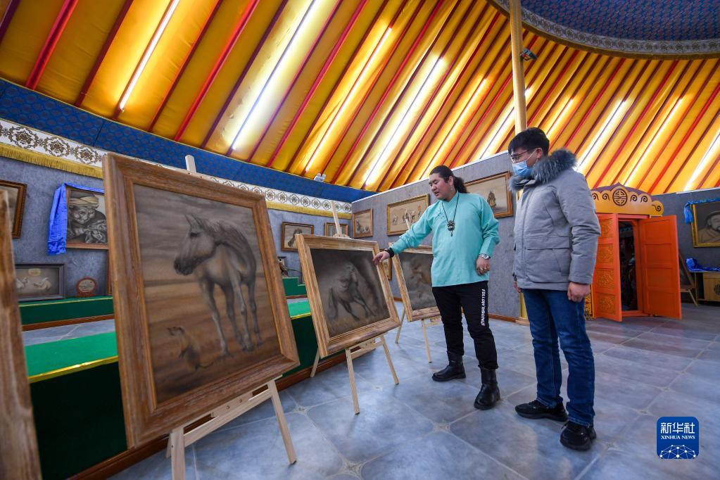 1月4日,阿拉騰畢力格(左)為游客(右)介紹自己創(chuàng )作的沙畫(huà)藝術(shù)作品。