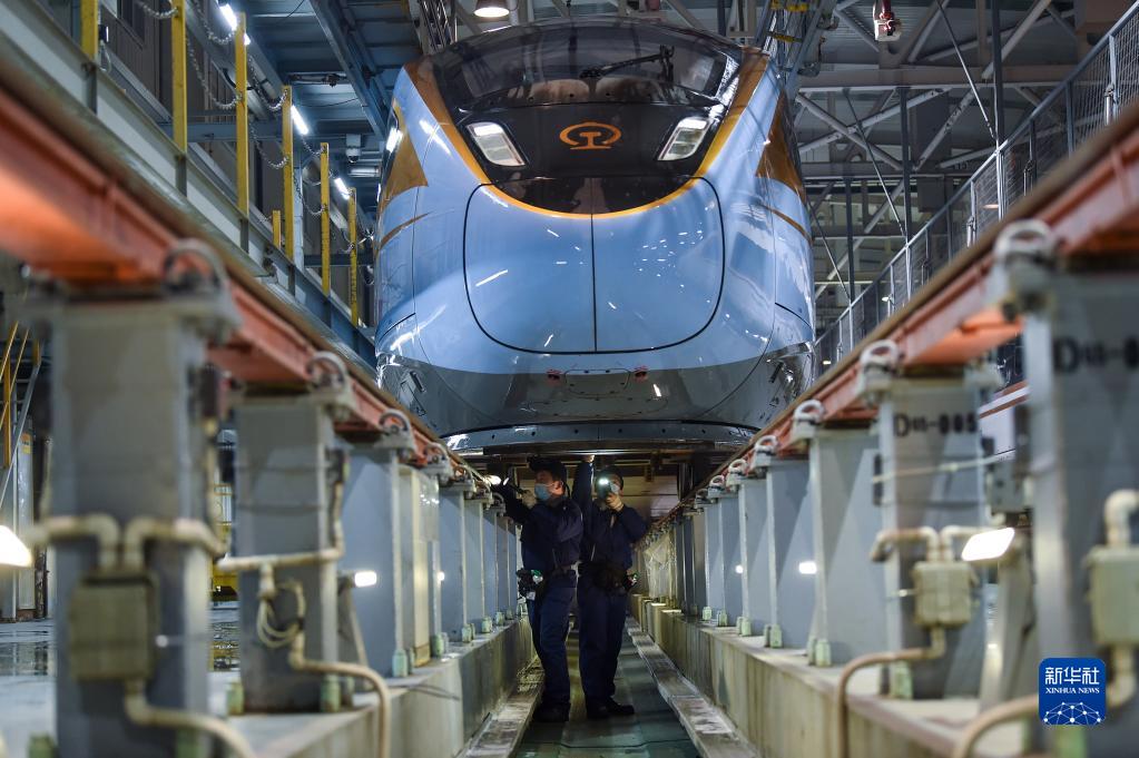 1月6日,在南京動(dòng)車(chē)段南京南動(dòng)車(chē)運用所檢修庫,地勤機械師在檢修動(dòng)車(chē)車(chē)頭部位。