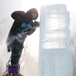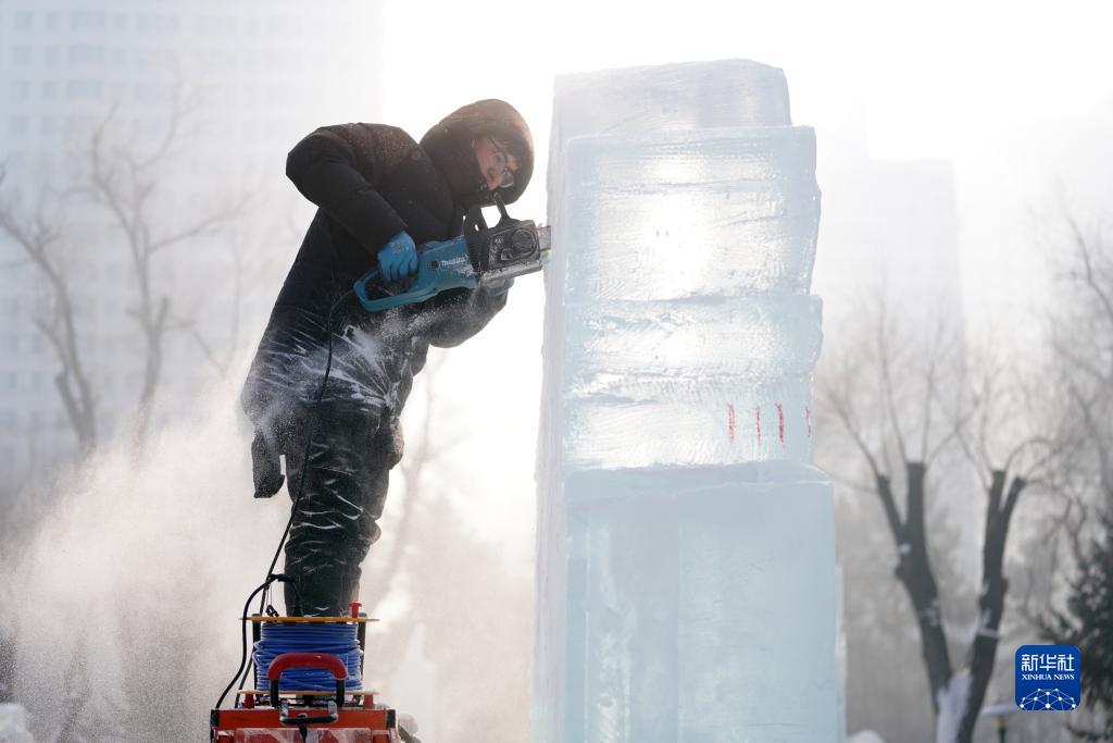 1月6日,在哈爾濱冰燈藝術(shù)游園會(huì )園區,冰雕師在進(jìn)行冰雕作品創(chuàng )作。
