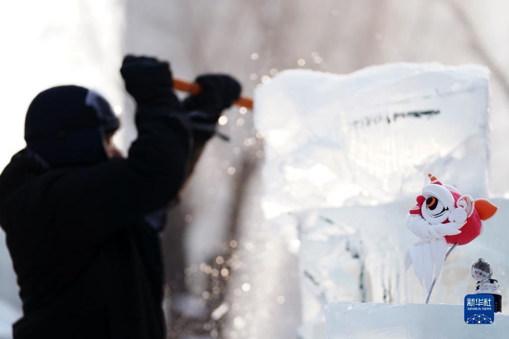 1月6日,在哈爾濱冰燈藝術(shù)游園會(huì )園區,冰雕師在進(jìn)行冰雕作品創(chuàng )作。