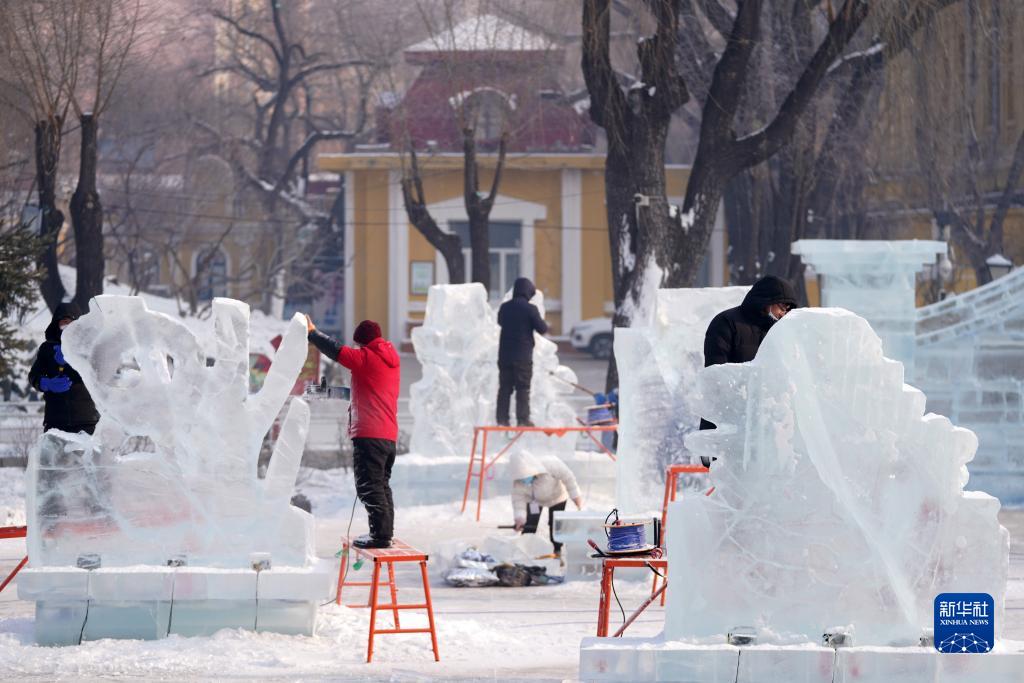 1月6日,在哈爾濱冰燈藝術(shù)游園會(huì )園區,冰雕師在進(jìn)行冰雕作品創(chuàng )作。