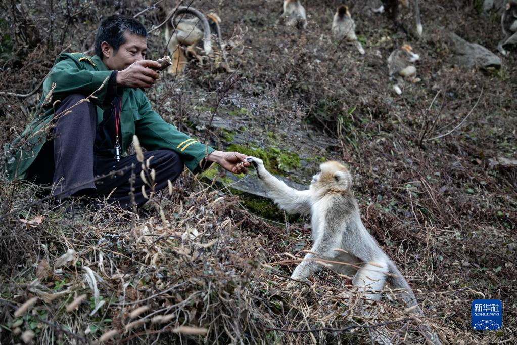 楊忠錄與大熊貓國家公園甘肅省片區裕河園區內的川金絲猴互動(dòng)(1月4日攝)。