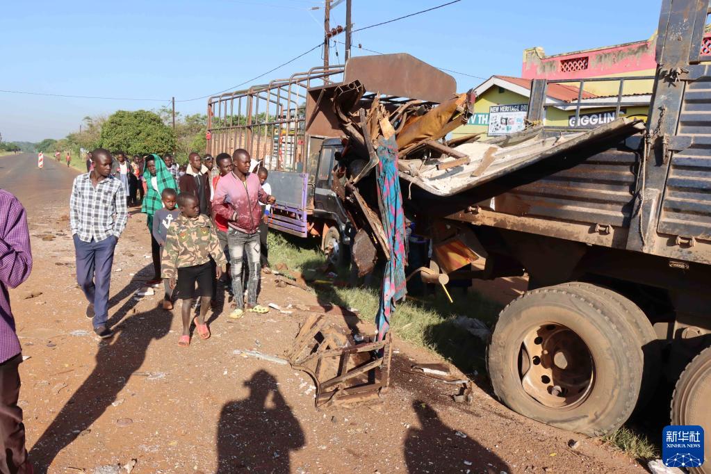 1月6日,在烏干達首都坎帕拉通往古盧的公路旁,人們查看事故現場(chǎng)。