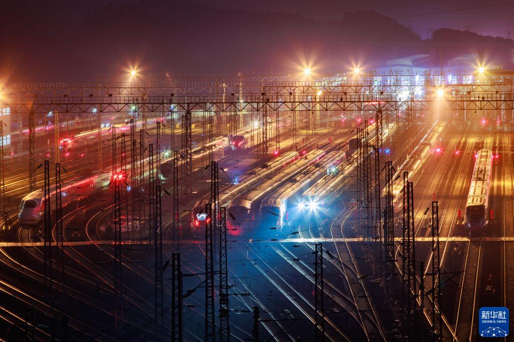 1月7日,2023年春運啟動(dòng)。1月6日晚,在中國鐵路成都局集團有限公司貴陽(yáng)北動(dòng)車(chē)所,??吭诖孳?chē)線(xiàn)上的動(dòng)車(chē)排列整齊如同一支“陸地艦隊”。