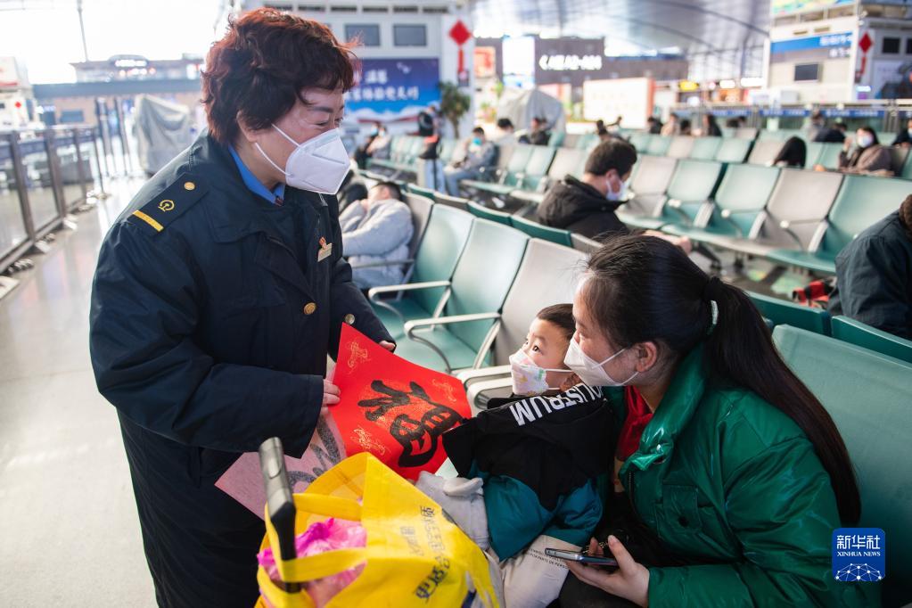 1月7日,在長(cháng)沙南站候車(chē)室,工作人員給旅客送“?!弊?。