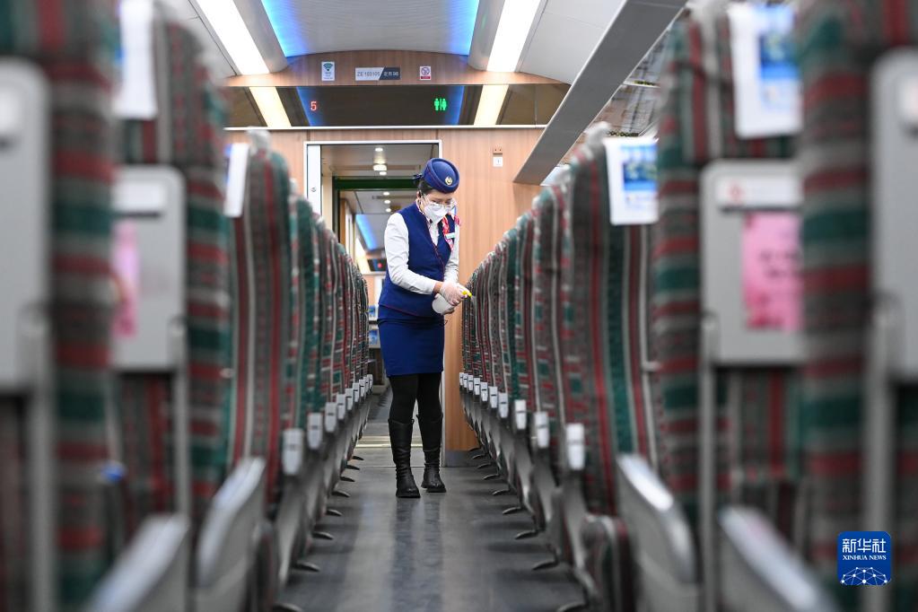 1月7日,在烏魯木齊站,C861次動(dòng)車(chē)的列車(chē)員在車(chē)廂噴灑消毒液。