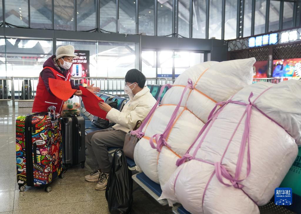 1月7日,在蘇州火車(chē)站候車(chē)大廳,志愿者向旅客贈送年畫(huà)。